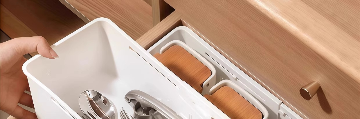 Drawer storage box, compartmentalized storage box, expandable cosmetic dressing table, kitchen cabinet, classified storage box