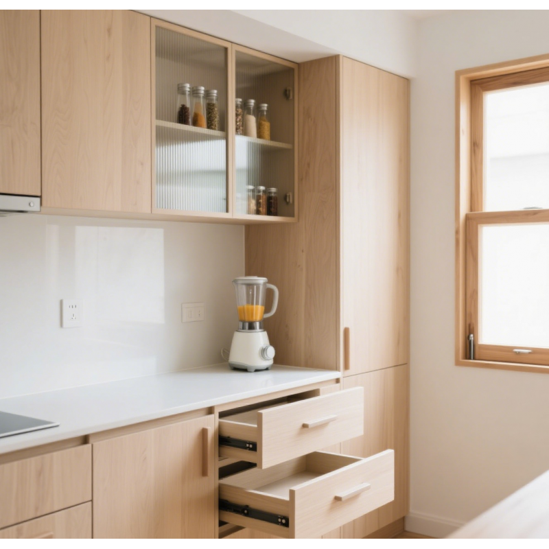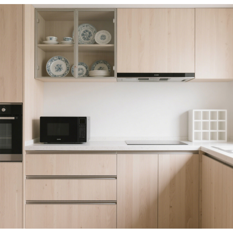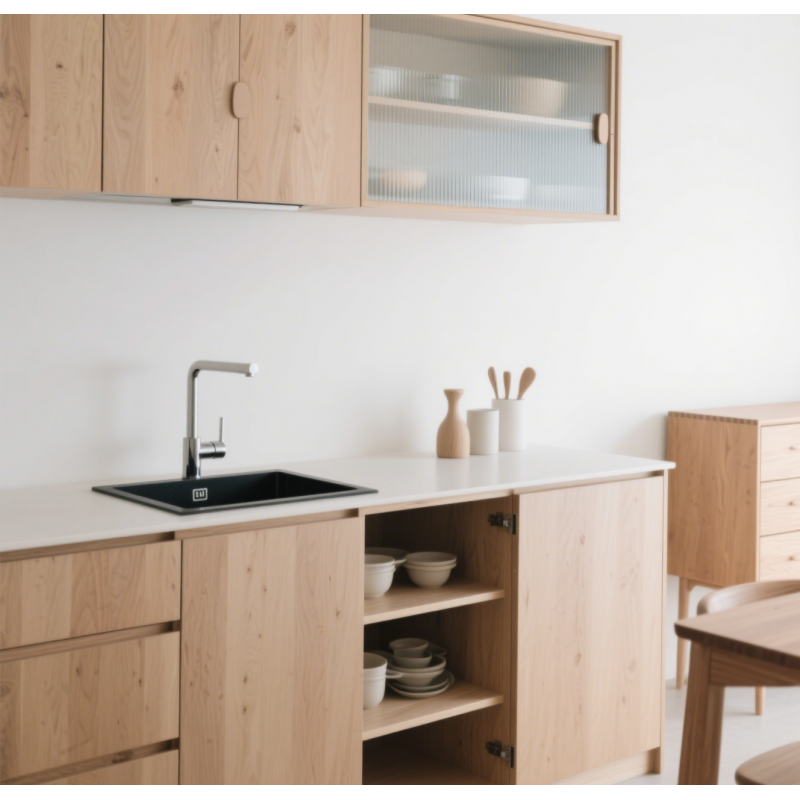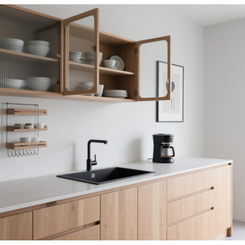 Minimalist Style Scandinavian Light Wood Kitchen Set with Glass-Front Wall Cabinets and Black Built-in Sink