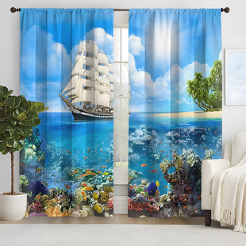 2pcs new ocean patterned curtains cross-border manufacturer supplies 3D digital printed high-precision curtains for living rooms and bedrooms