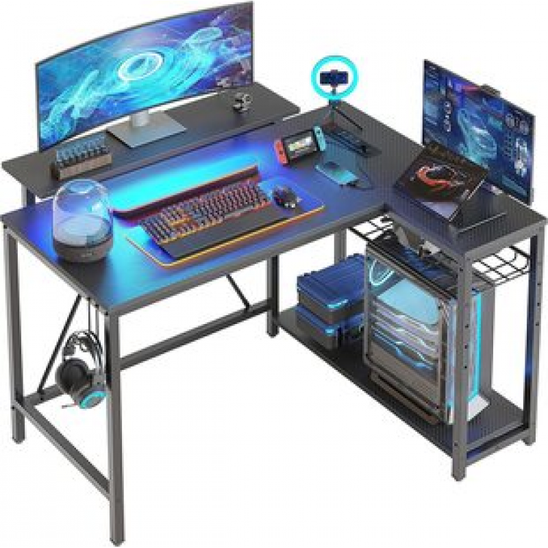 Cross border small L-shaped desk with charging port and LED light strip, modern computer desk with foldable storage rack