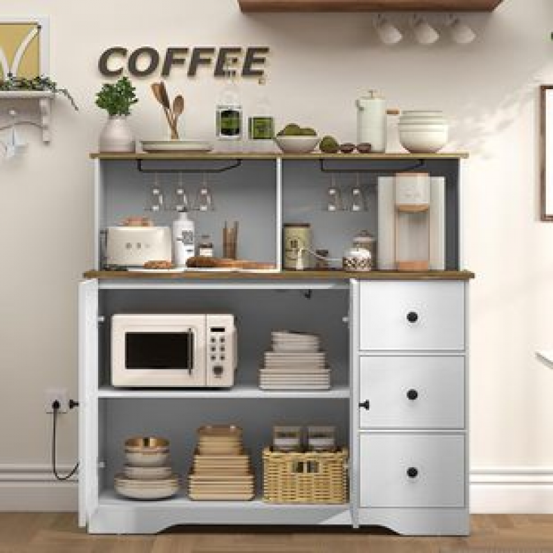 Tableware cabinet with power socket, wine bottle and glass rack, and adjustable shelf, wine cabinet, kitchen, farmhouse, coffee bar cabinet