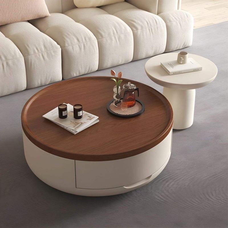 Light Luxury Coffee Table Italian Living Room Center Table Round Coffee Table with White Wood Base Drawers Storage