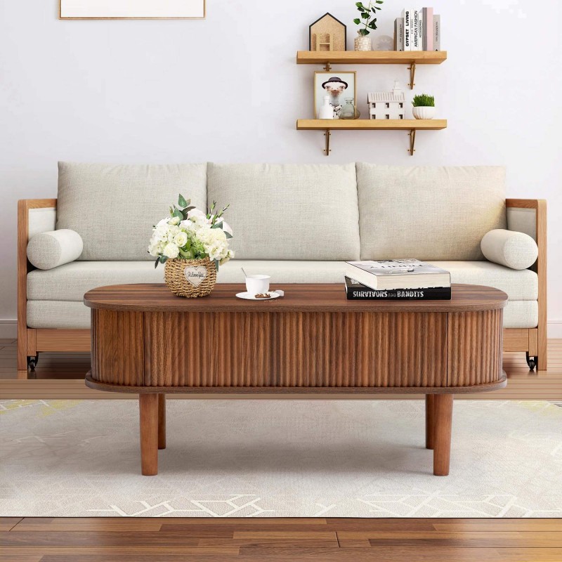 Modern Oval Lift Tabletop Coffee Table Center Wood Living Room Coffee Table Base Table with 3 Compartments Storage