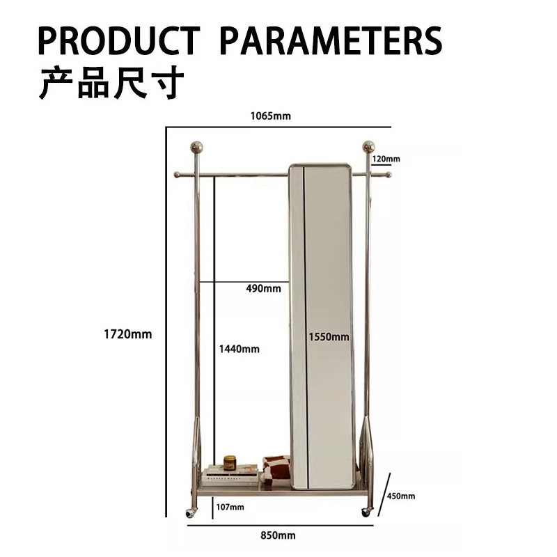 Movable full-length mirror, light luxury stainless steel, insulated, floor-standing, dual-purpose combination