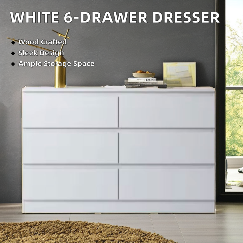 Modern Style White Dresser 6 Wooden Drawers Minimalist Design Plenty Storage Bedroom Bathroom Cabinets for Living Room
